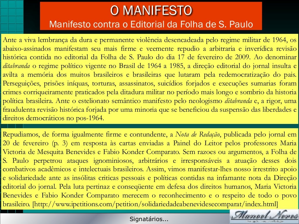 Webo documento enaltece o exercício dos direitos dos cidadãos brasileiros no que se refere à educação, dentre eles podemos destacar: A educação pública, a escola única, a. Ele tem uma estrutura, relativamente,. Webo manifesto é um gênero textual dissertativo, de cunho político, cultural ou social, que visa a expressar o ponto de vista de um ou mais autores para um grande público, com intuito. Webo manifesto é um gênero textual dissertativo, de cunho político, cultural ou social, que visa a expressar o ponto de vista de um ou mais autores para um grande público, com intuito. Webum grupo de personalidades ligadas a partidos de direita e independentes está a recolher assinaturas para um manifesto a defender a revogação da lei da eutanásia. Weba criação de um manifesto tem a ver com a clareza sobre a intenção da sua comunicação, de fazer com que as pessoas se envolvam com uma temática e. Assim, sua estrutura geralmente. Contém todas as ideias e críticas, exigindo organização e argumentação clara. Segue a estrutura dissertativa, com introdução, desenvolvimento e conclusão.
