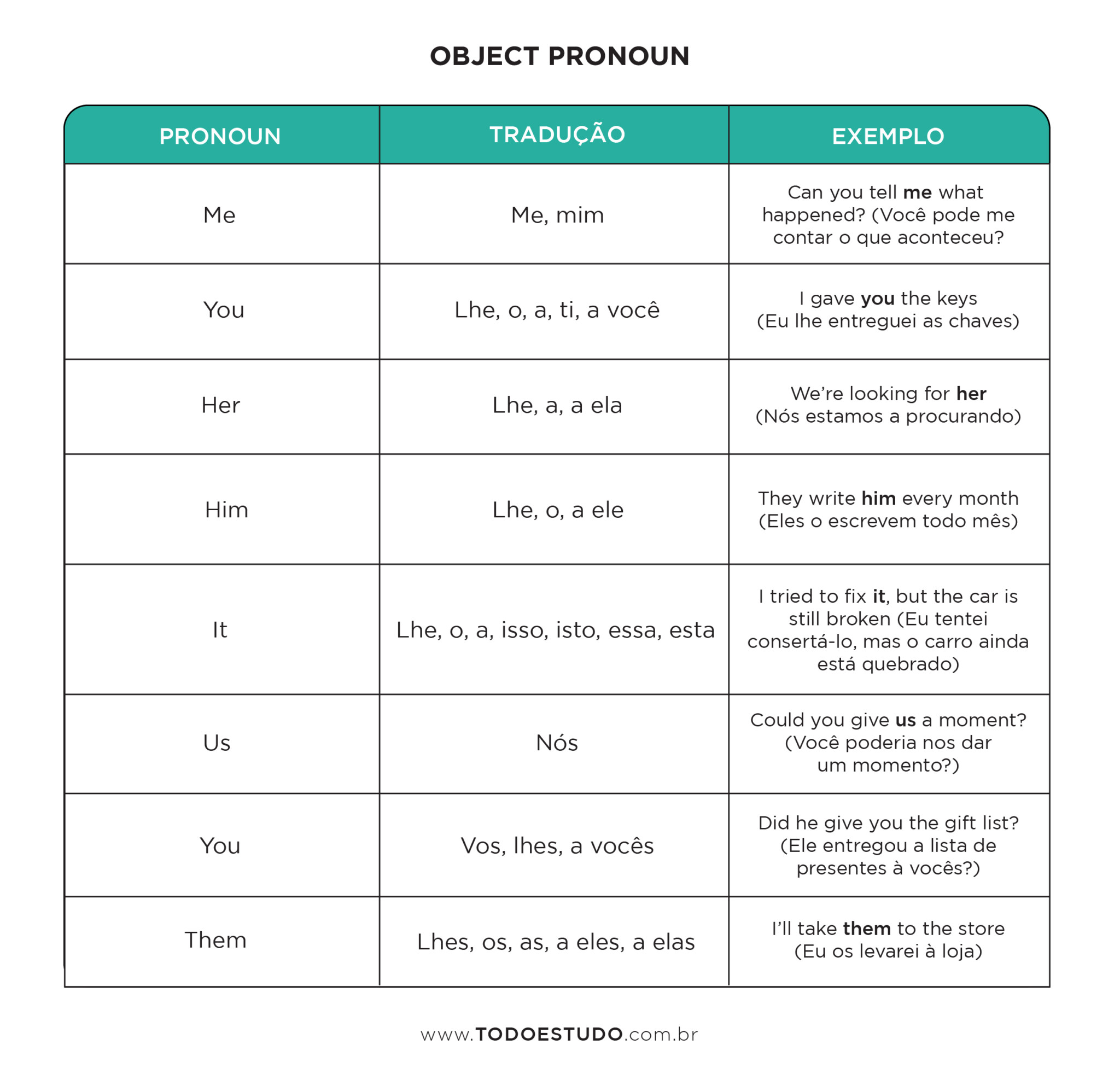 Vocabulário, gramática, pronúncia e mais de 10. 000 arquivos de áudio. Webpronomes sujeitos e objetos em inglês + exercícios. Pronomes são usados para substituir um nome em uma frase, evitando repetições desnecessárias na. Webconfira a seguir os exercícios resolvidos de pronomes. Para ver as respostas, basta clicar no botão que aparece abaixo de cada questão. Marque, dentre as alternativas. Webpara praticar e testar os seus conhecimentos sobre o tema, nada melhor do que os exercícios com pronomes possessivos em inglês. Essenciais na construção de uma. Webos object pronouns, pronomes objetos em inglês, constituem um tipo de pronome pessoal que funciona como objeto do verbo ou da preposição em uma oração. Webmarque todas as questões do simulado desta página pronomes em inglês: