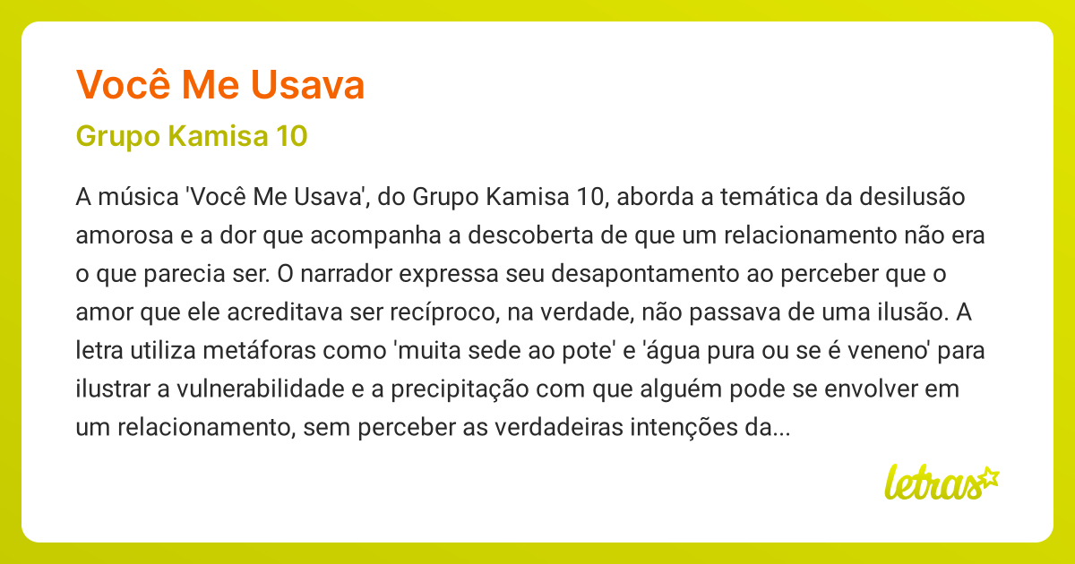 Significado da música VOCÊ ME USAVA (Grupo Kamisa 10) - LETRAS.MUS.BR